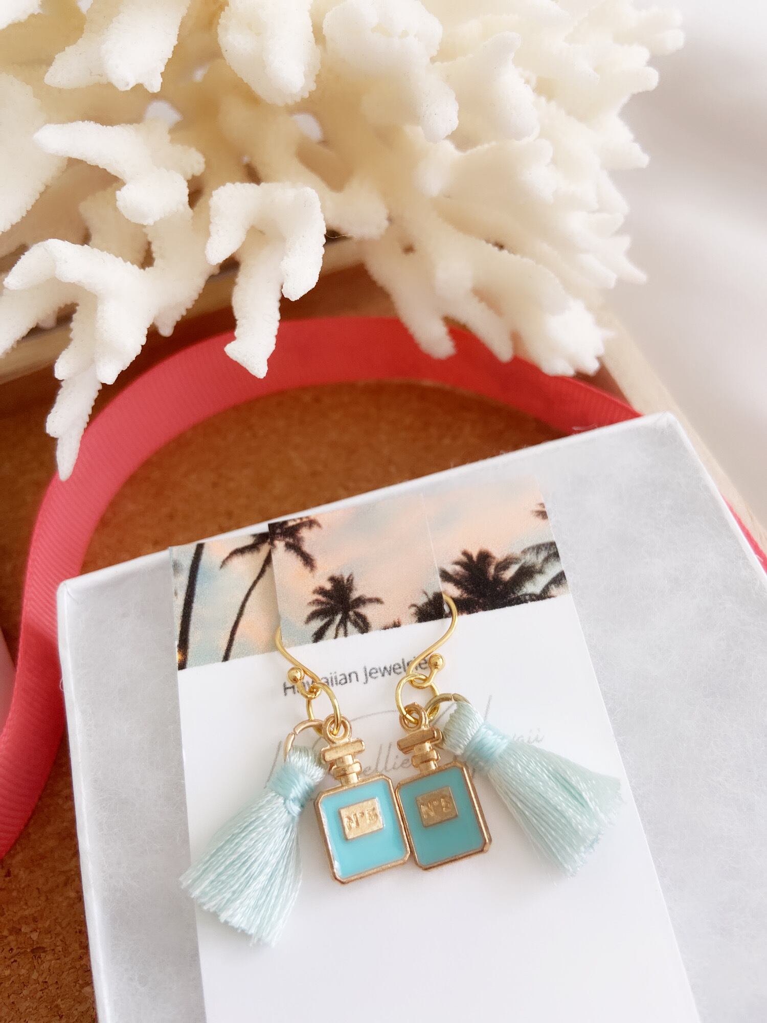 香水ボトルのチャームとフリンジのキュートなピアスです。