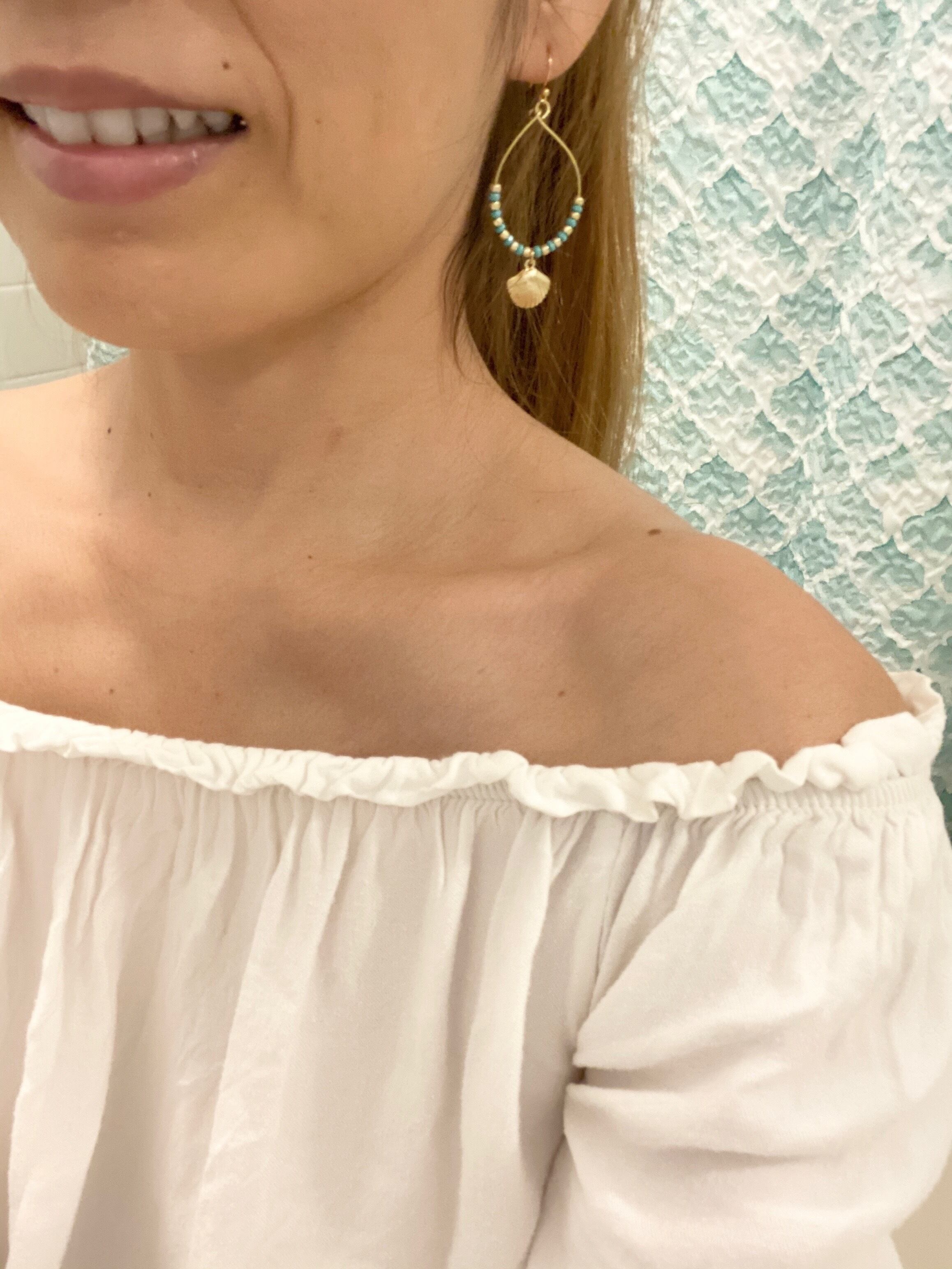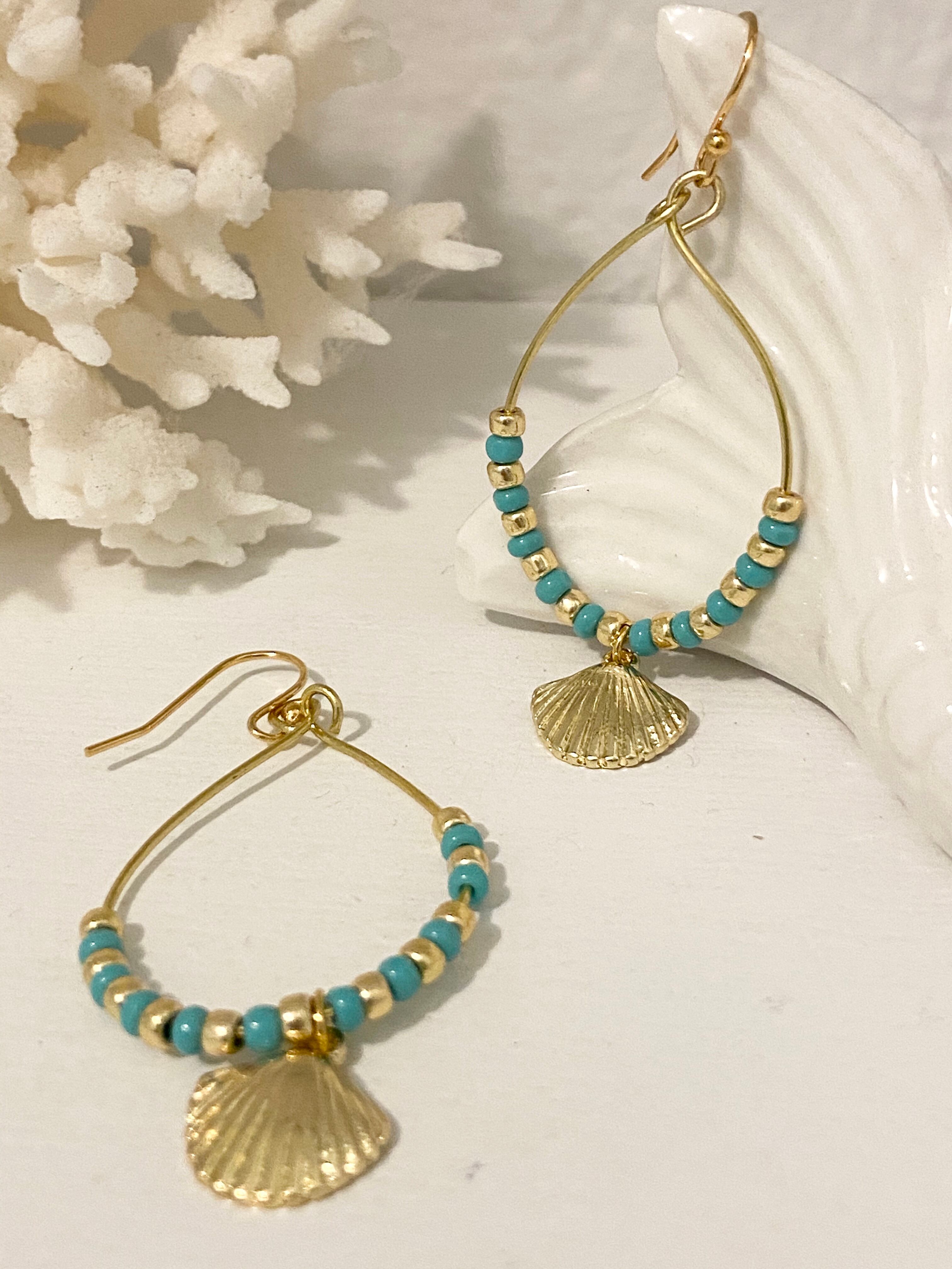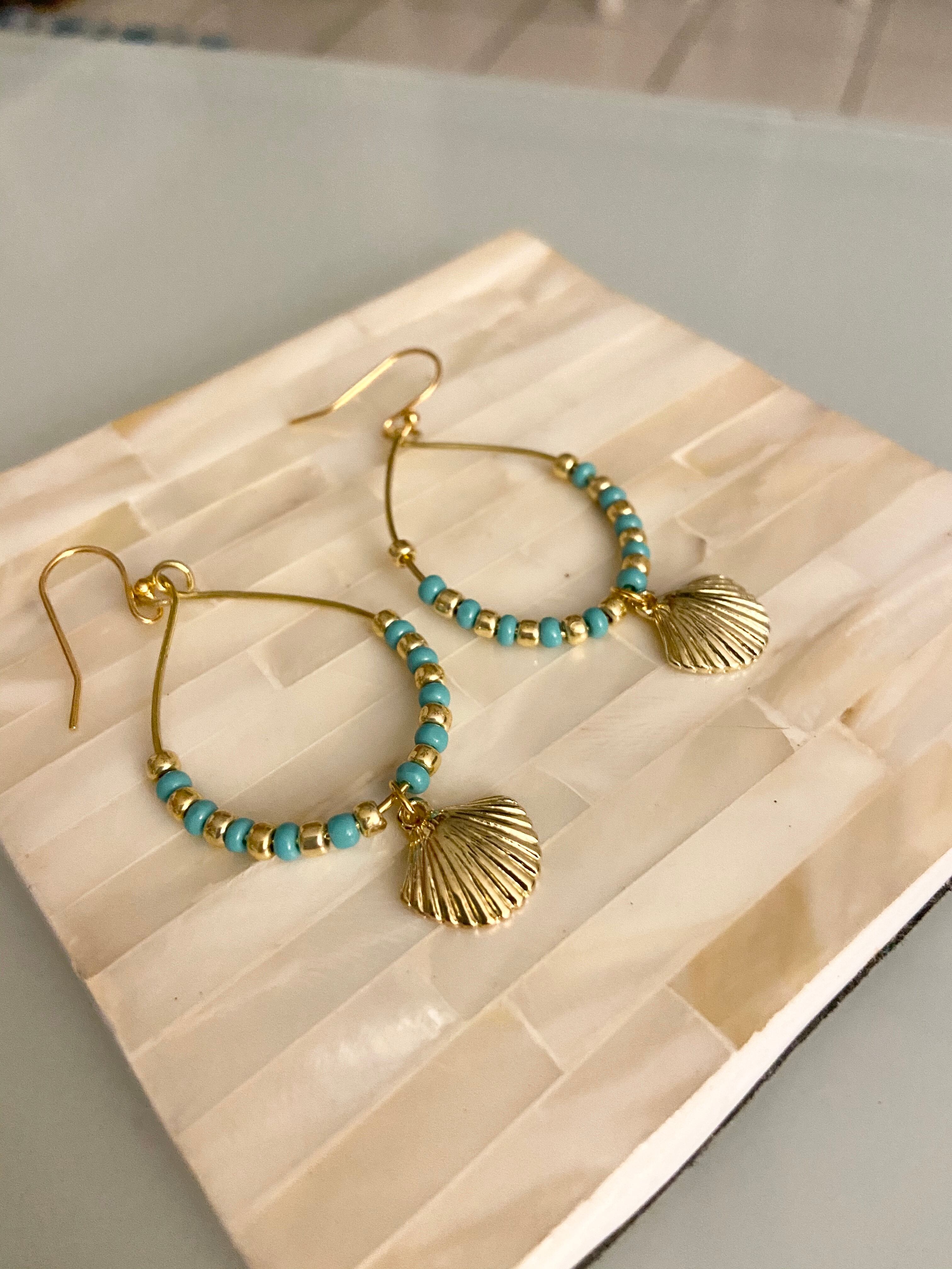 ハワイのビーチを想像させるターコイズブルーとシェルを使ったピアスです。
