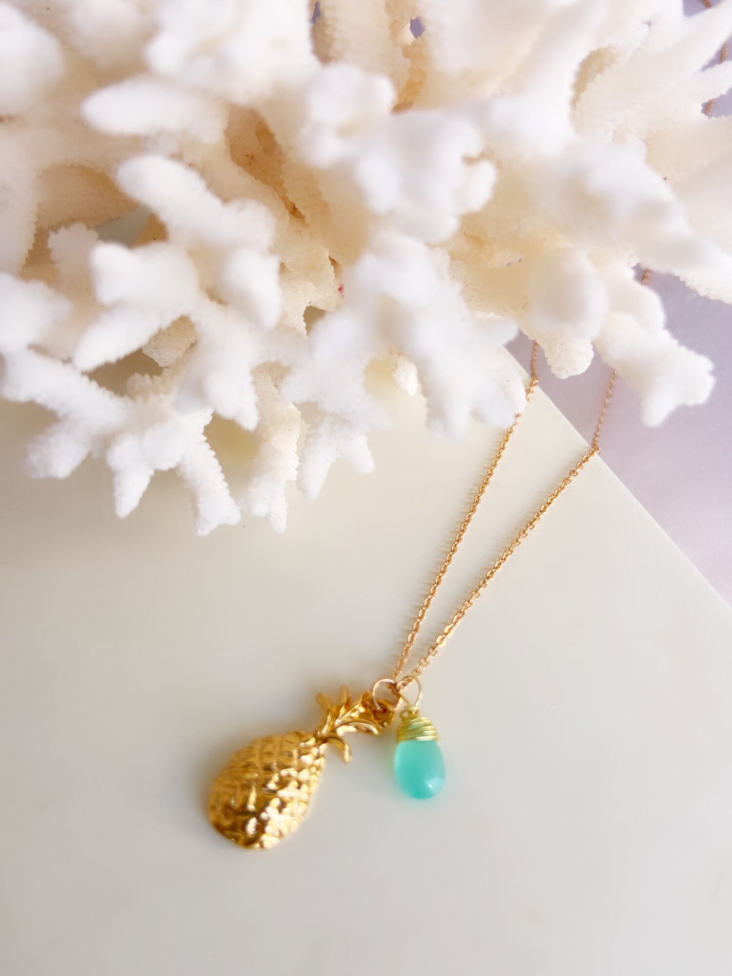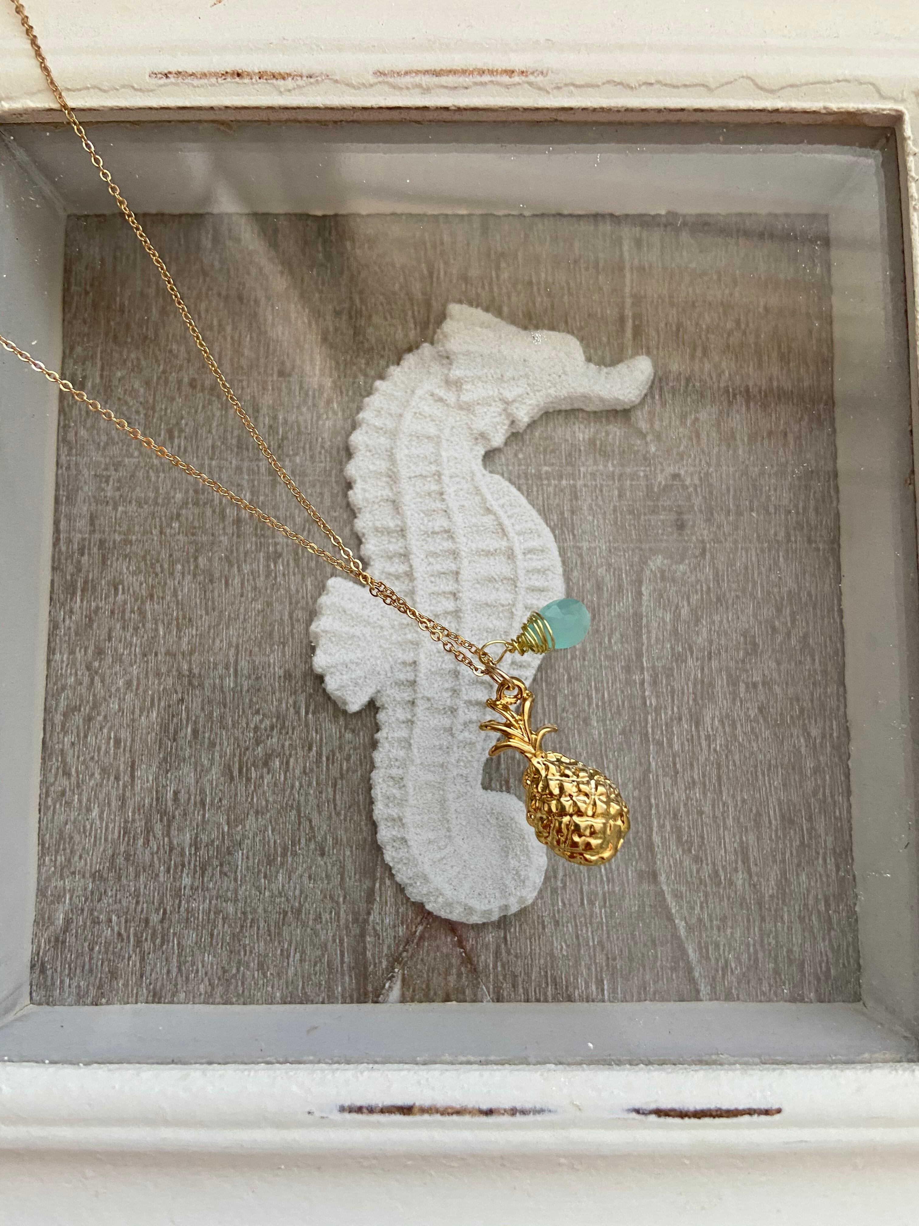 パイナップルと天然石カルセドニーのチャームのハワイアンネックレスです。