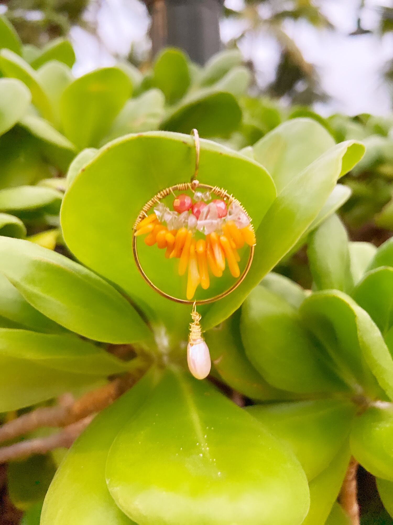 たっぷりのオレンジコーラルとクォーツ、マザーオブパールを使った ゆらゆらタイプのハワイアンピアスです。