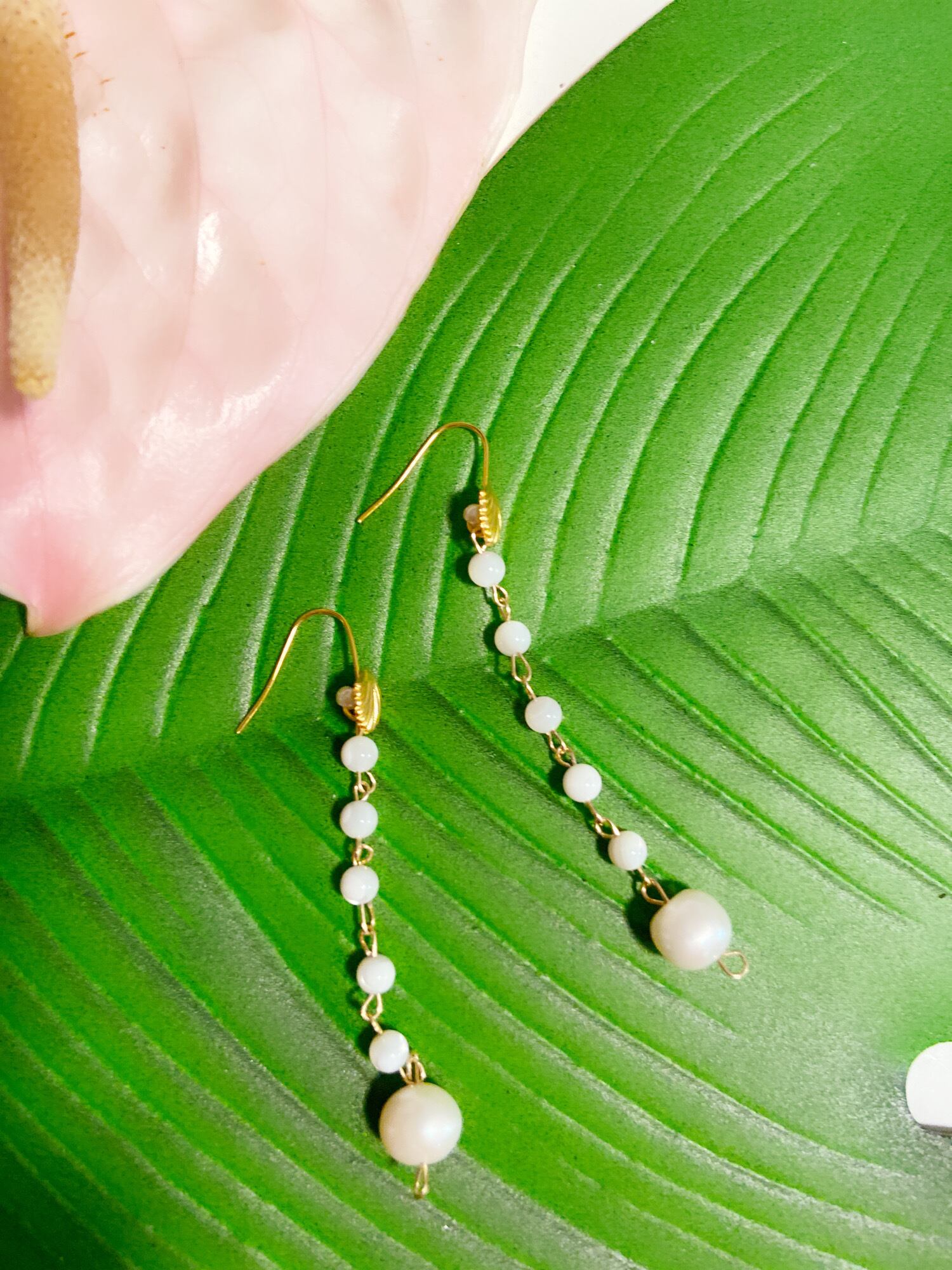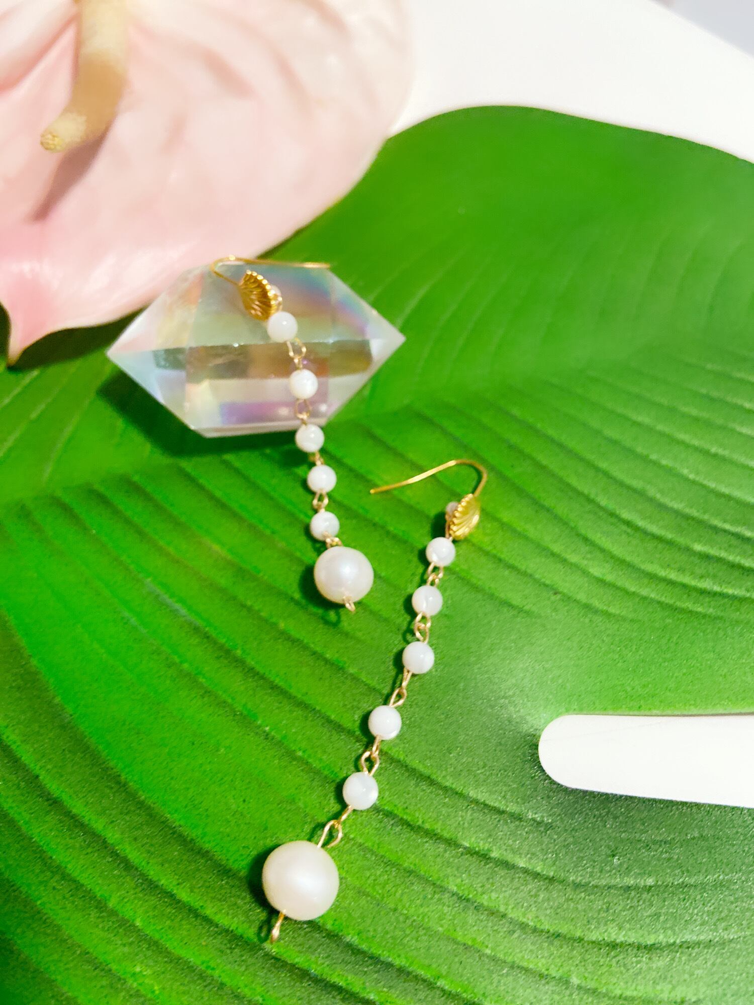 大粒フレッシュウォーターパールと可愛いマザーオブパールがゆらゆら揺れるロングタイプピアスです。