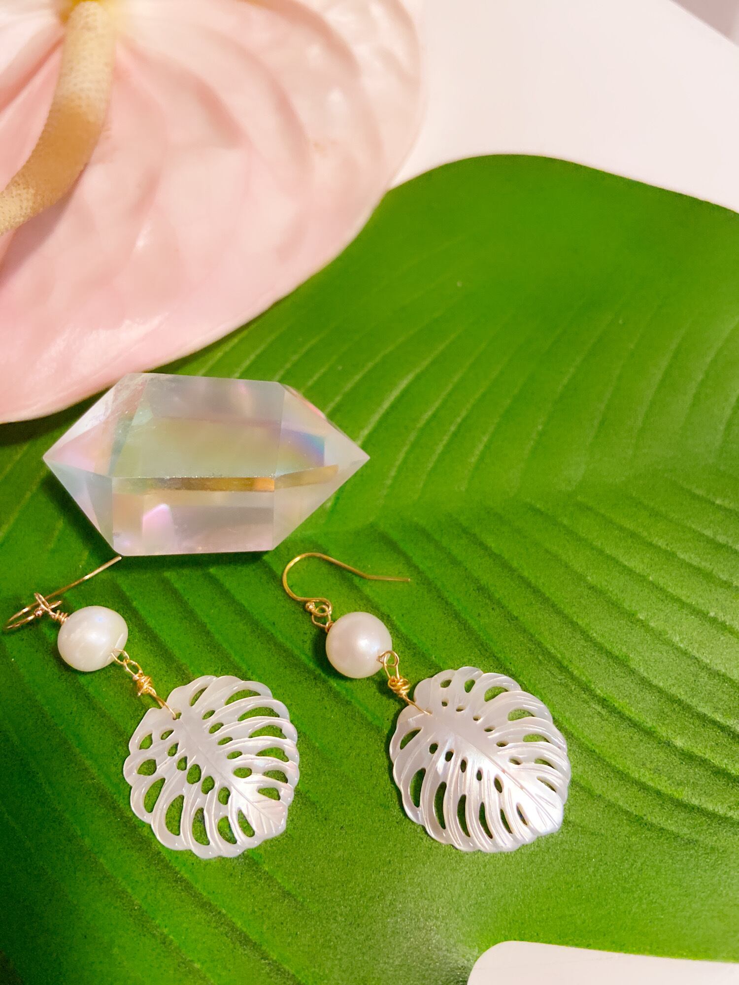 ハワイでよく咲いているモンステラの葉。希望の光を導くとも言われている幸運の葉っぱです。そんなモンステラのシェルと大粒フレッシュウォーターパールのハワイアンなネックレスです!