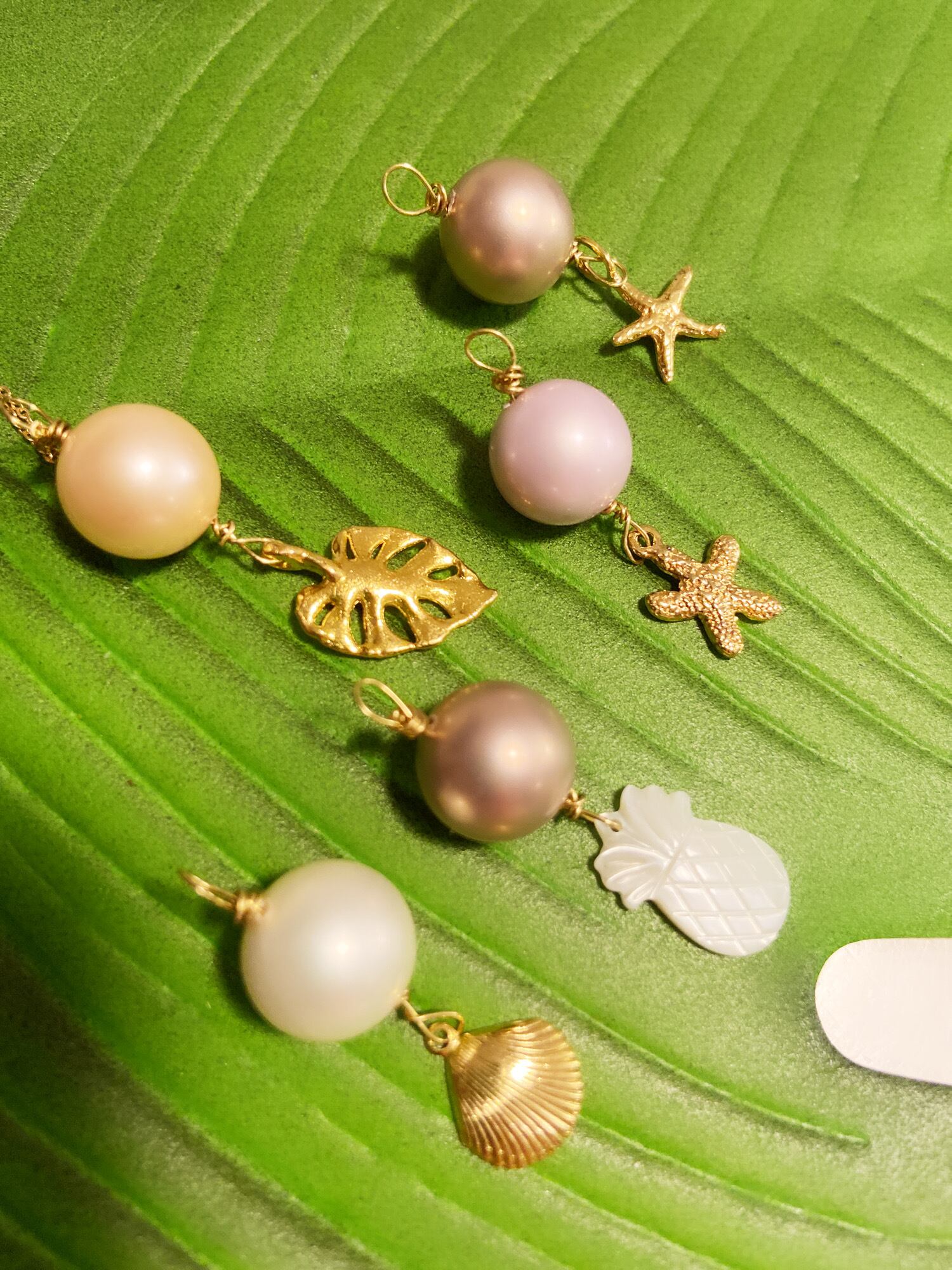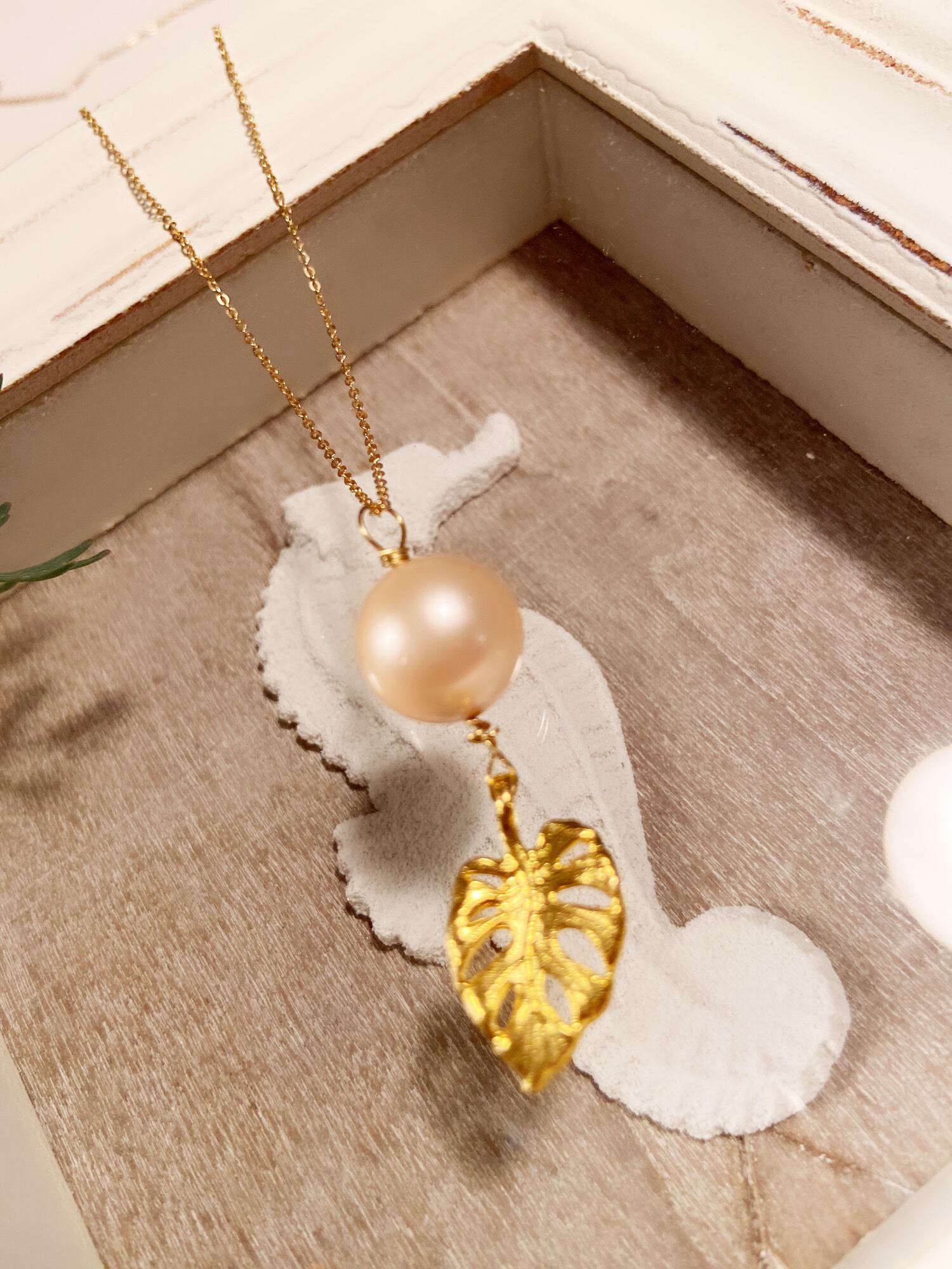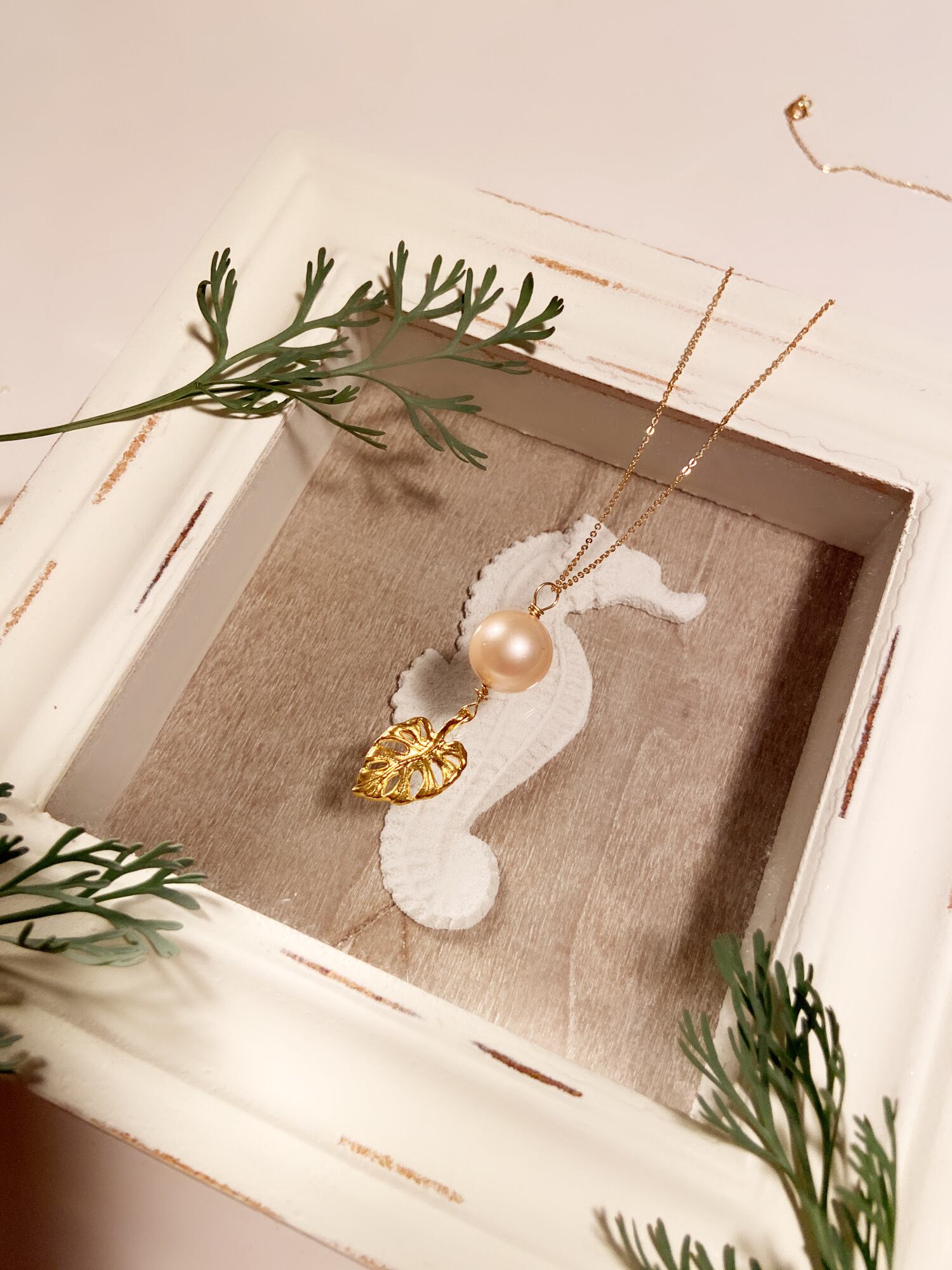 大粒のシェルパールを使った存在感のあるネックレスです。モンステラのチャームがついています。