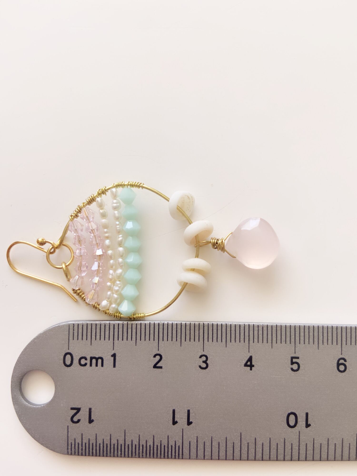ピンクカルセドニーとプカシェル、フレッシュウォーターパールにクリスタルビーズを使っています。