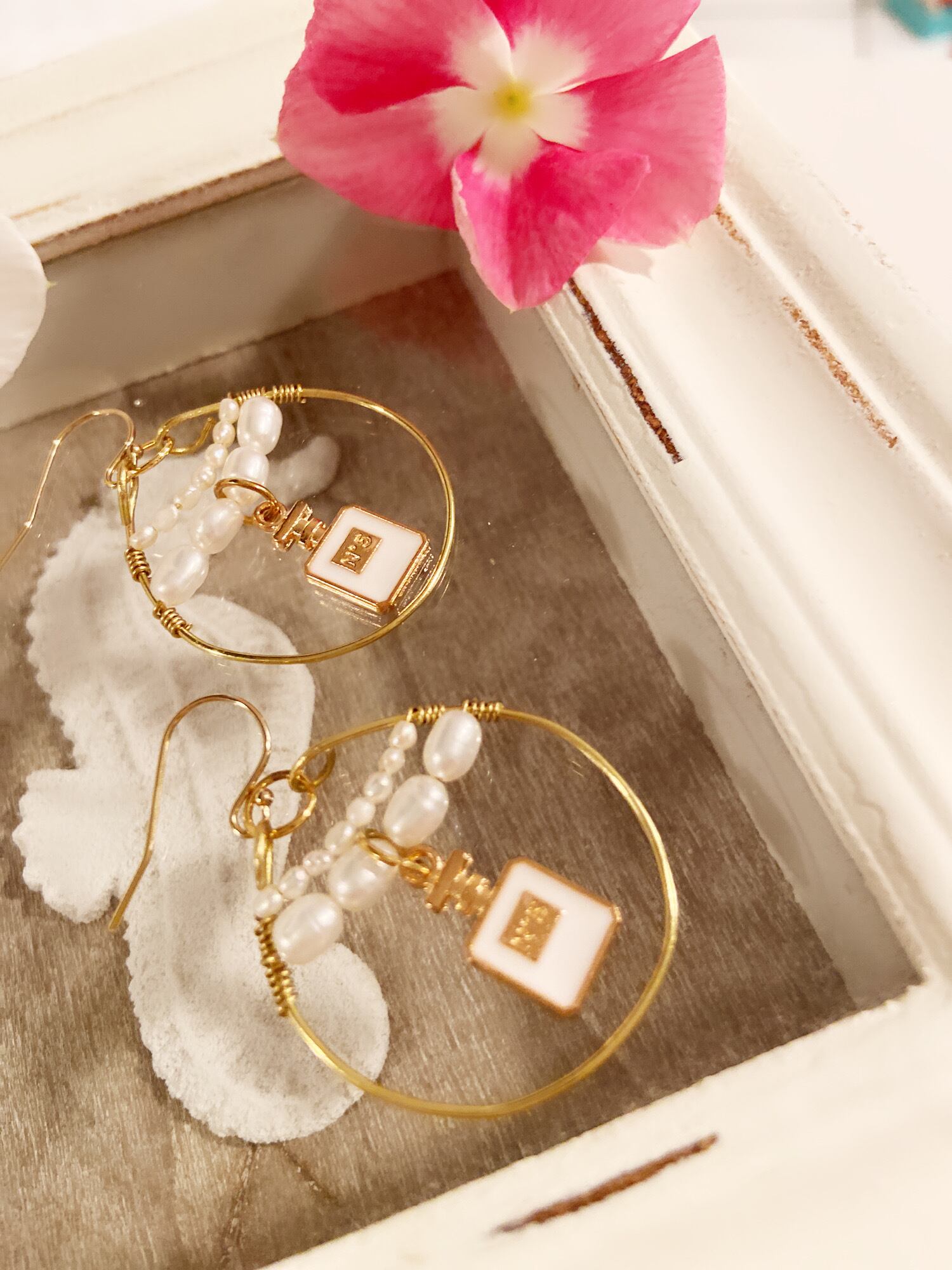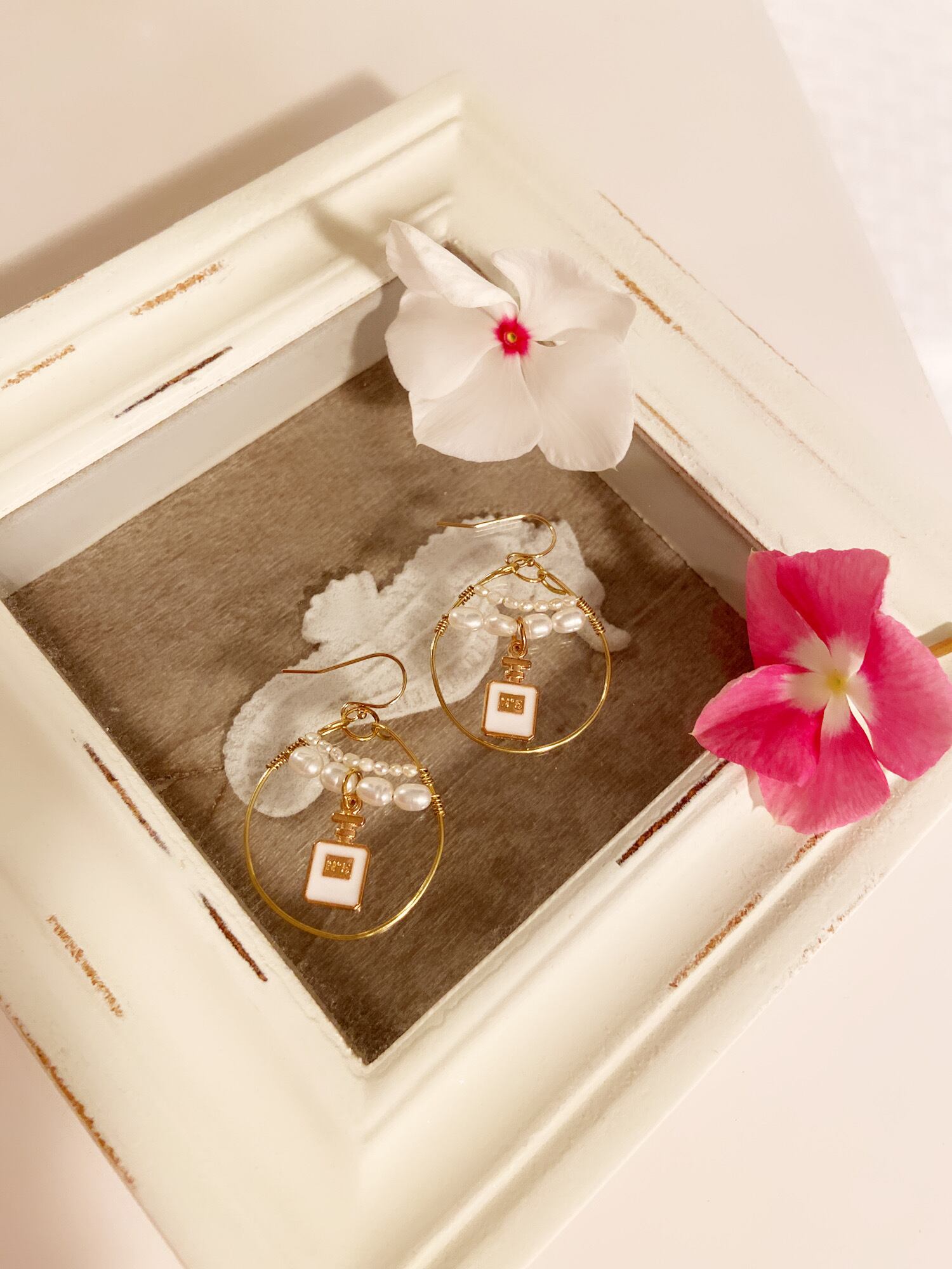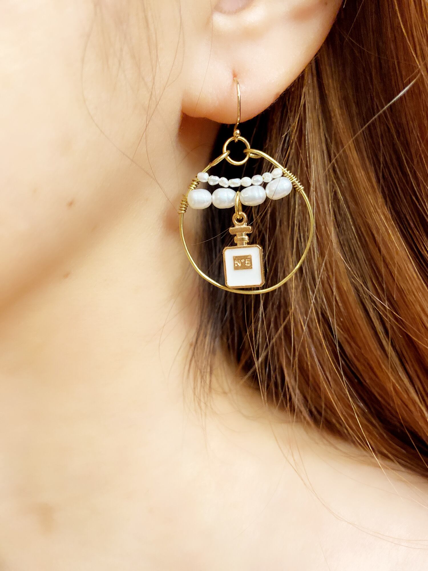 可愛い香水瓶とフレッシュウォーターパールを2種類使ったピアスです。
