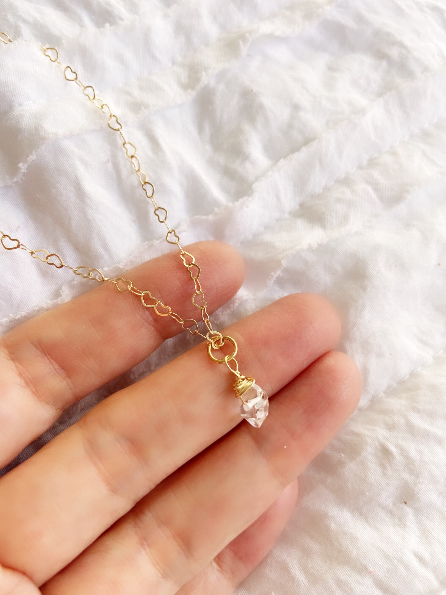 透明感のあるハーキマーダイヤモンドのネックレスです!チェーンはハート形の14金ゴールドフィルドを
